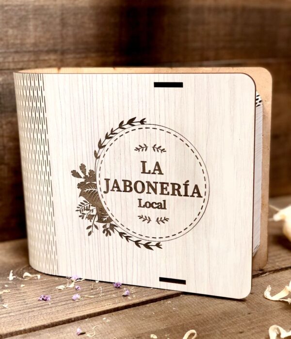 Caja de diseño en MDF ecológico, diseño exclusivo tipo libro con troquelado en curva y estampado en texturas biodegradables que dan un toque de distinción.
