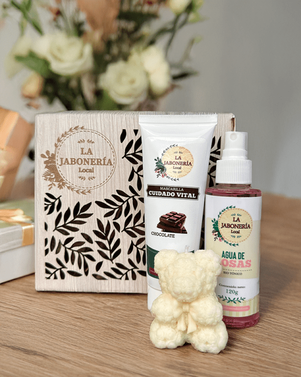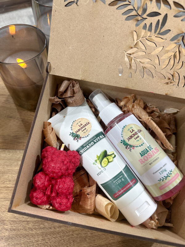 Kit Cuidado contiene: Mascarilla de chocolate, Vela Aromática x2ogr, agua de rosas, empaque caja de madera de lujo.