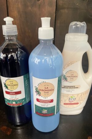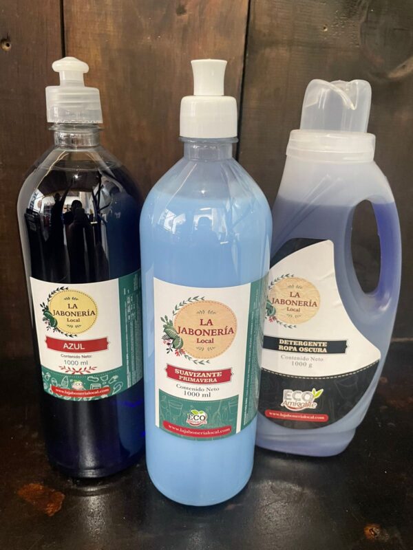Descripción Kit ideal para el cuidado de telas, este contiene; 1lt jabón azul, 1lt suavizante, 1lt detergente ropa oscura