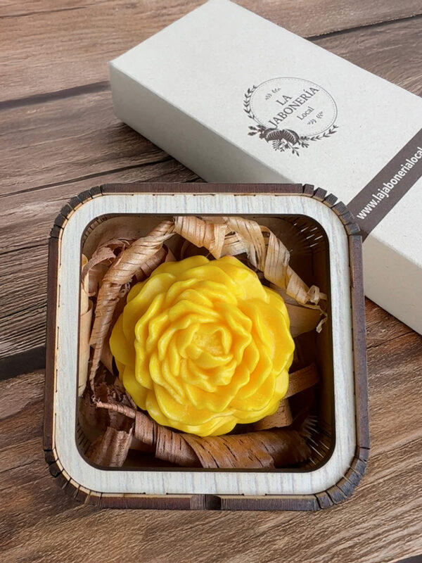 Vela individual en forma de rosa, presentada en caja de MDF, lista para regalar o usar como decoración. Diseño y aroma en un solo detalle.